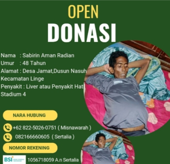Sabirin Aman Radian (48 Tahun) warga kampung Jamat kecamatan Linge Aceh Tengah, Ianya menderita kangker stadium 4. Saat ini sangat membutuhkan uluran tangan dari berbagai pihak.
