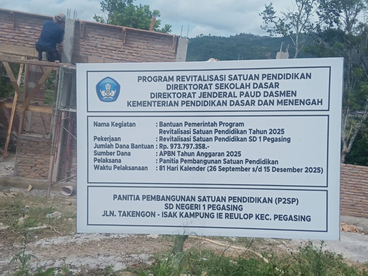 Bantuan Pemerintah Program Revitalisasi Satuan Pendidikan Tahun 2025. Revitalisasi SD Negeri 1 Pegasing dengan waktu pelaksanaan 81 hari kalender, terhitung sejak 26 September hingga 15 Desember 2025