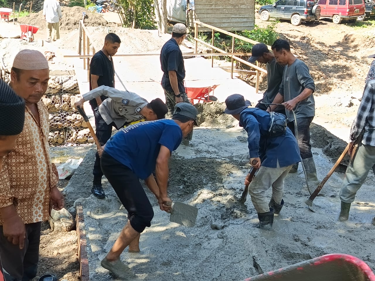 Aparat kepolisian dari Polsubsektor Rusip Antara Polres Aceh Tengah bersama masyarakat mempercepat pemulihan akses antar kampung melalui kegiatan gotong royong pengecoran lantai jembatan darurat di Kecamatan Rusip Antara, Kabupaten Aceh Tengah, Minggu (19/4/2026).