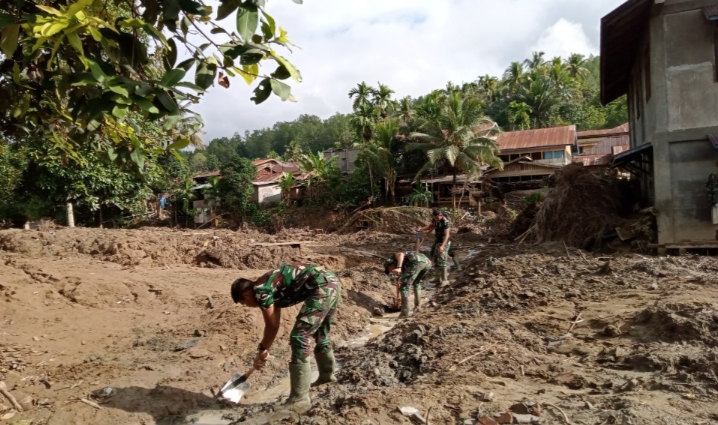 Pasca banjir bandang yang melanda sejumlah wilayah di Kabupaten Aceh Tengah, yonif TP 856/SBS yang dipimpin Danki Kapten Inf M.Habil Dan Danton Letda Inf Andy Firmansyah bersama warga kampung pantanNangka kecamatan Linge Kabupaten Aceh Tengah bersihkan material banjir di pemukiman warga dusun Binje kampung setempat,