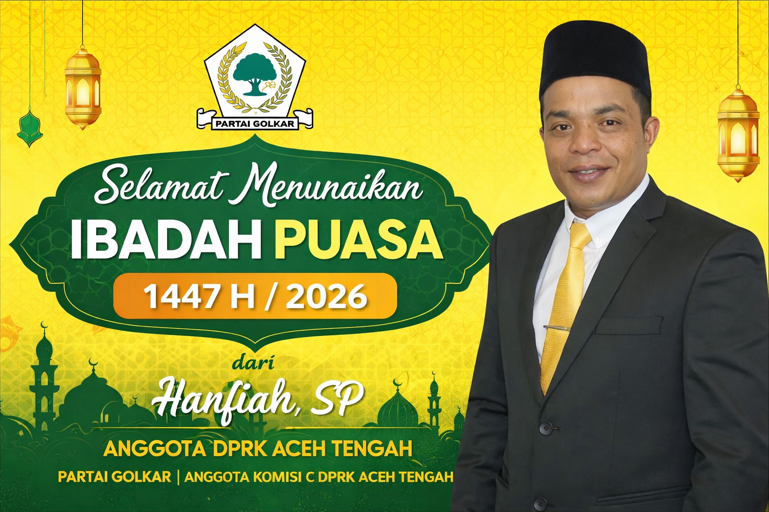 Aceh Tengah –WartaGayo.com: Anggota DPRK Aceh Tengah dari Partai Golkar, Hanfiah, SP, menyampaikan ucapan Selamat Menunaikan Ibadah Puasa Ramadan 1447 Hijriah/2026 Masehi kepada seluruh masyarakat, khususnya warga Kabupaten Aceh Tengah.