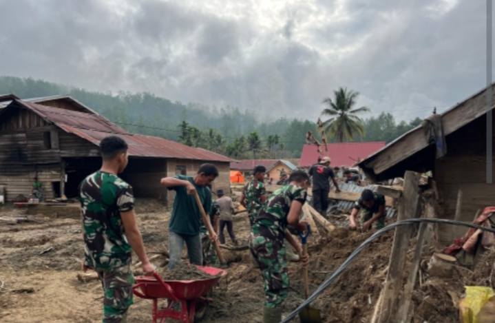 Pasca banjir bandang yang melanda sejumlah wilayah di Kabupaten Aceh Tengah, yonif TP 856/SBS yang dipimpin Danki Kapten Inf M.Habil Dan Danton Letda Inf Andy Firmansyah bersama warga kampung pantanNangka kecamatan Linge Kabupaten Aceh Tengah bersihkan material banjir di pemukiman warga dusun Binje kampung setempat,