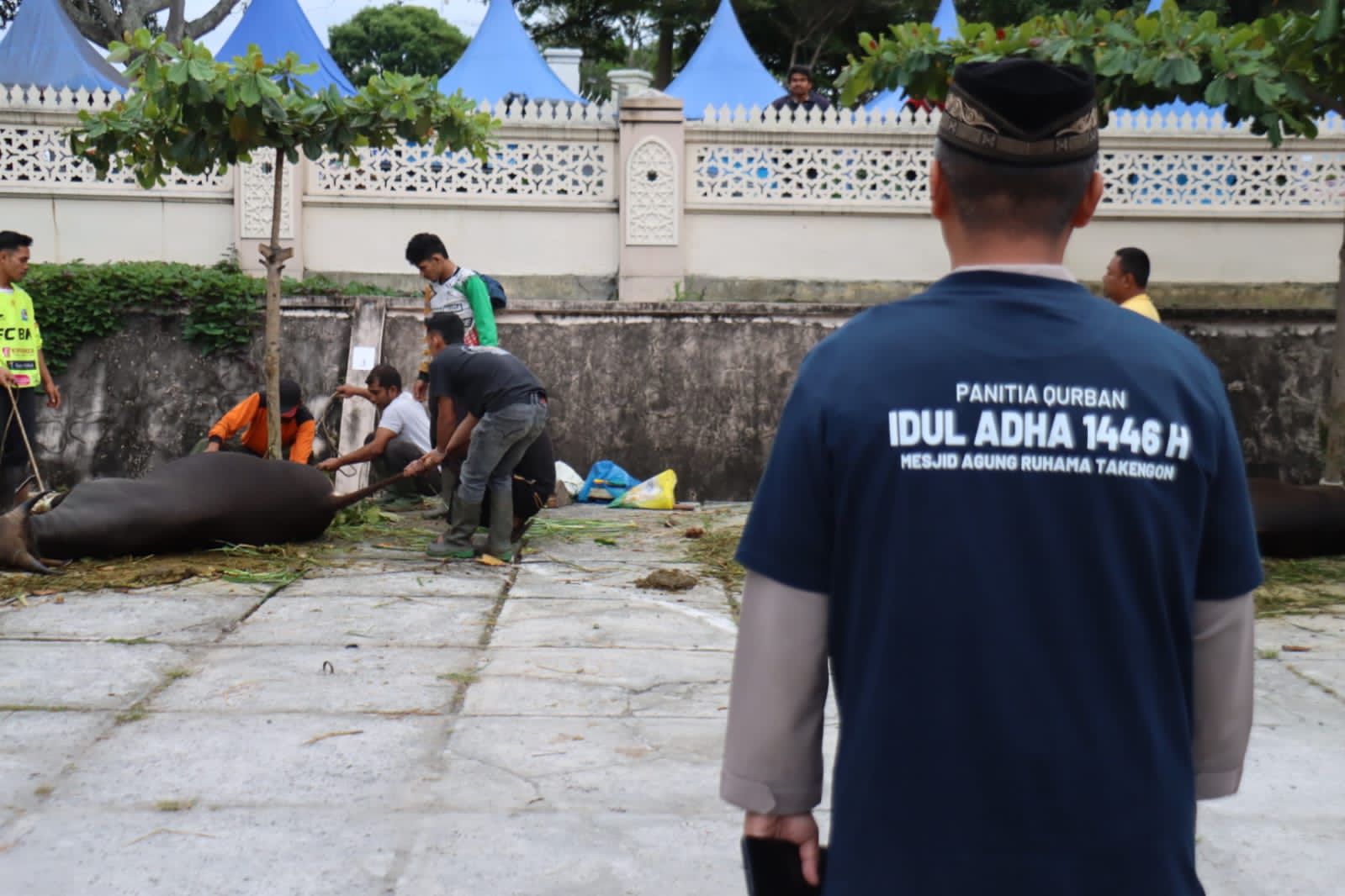 Suasana kebersamaan dan semangat berbagi tampak mewarnai prosesi penyembelihan qurban yang berlangsung khidmat di pekarangan Masjid Ruhama.