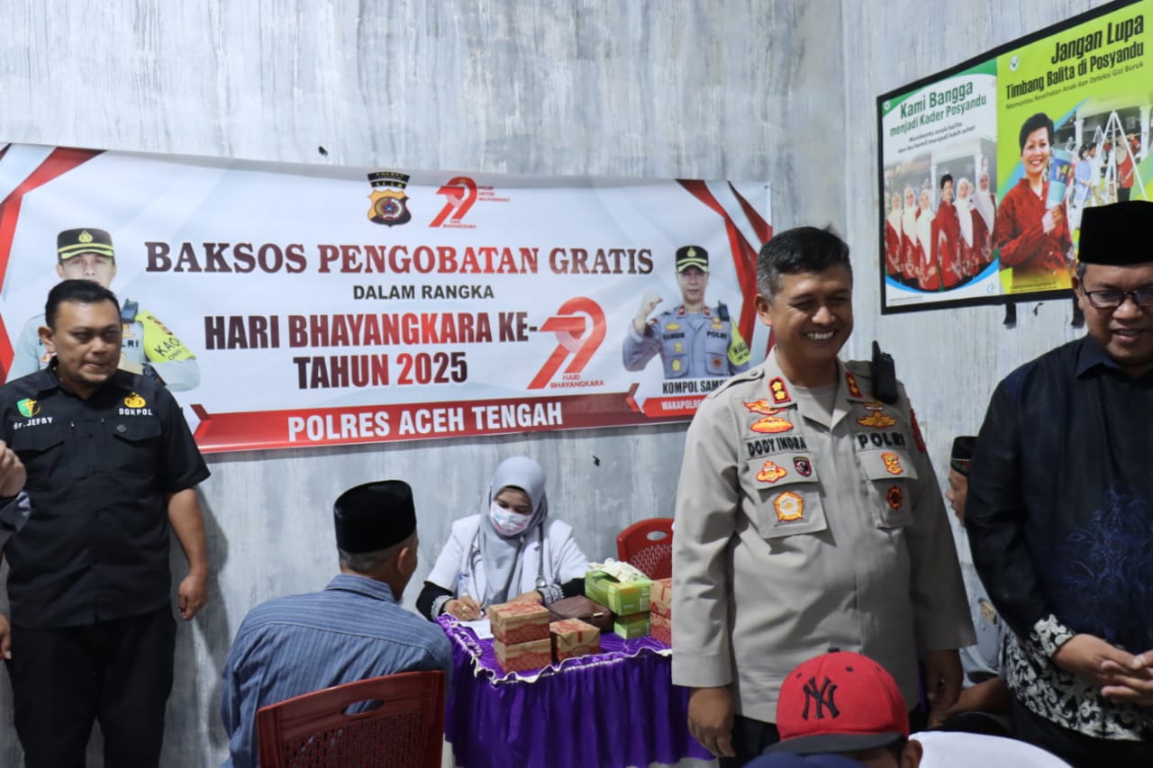 Menyambut peringatan Hari Bhayangkara ke-79, Polres Aceh Tengah melalui Seksi Dokkes (Sidokkes) melaksanakan kegiatan pengobatan gratis bagi masyarakat di Kampung Bukit, Kecamatan Kebayakan, Kabupaten Aceh Tengah, Senin (16/6/2025).