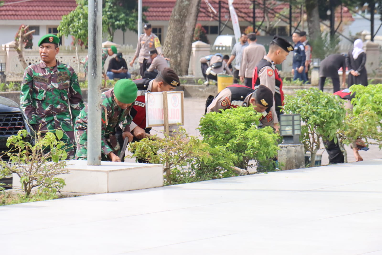 Gotong royong bersama yang dilaksanakan oleh TNI – POLRI meliputi kegiatan pembersihan taman, halaman, tempat berwudhuk dan pembersihan kamar mandi masjid.