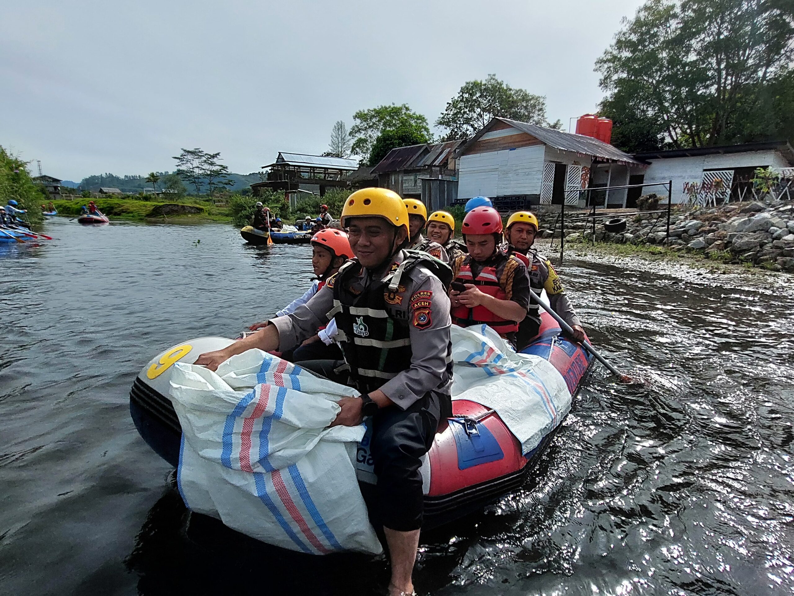 Dengan mengenakan pakaian lapangan, Kapolres AKBP Muhamad Taufiq dan personel tampak memungut sampah bersama para peserta di sepanjang aliran Sungai Peusangan, sumber air utama yang menghidupi masyarakat Aceh Tengah.