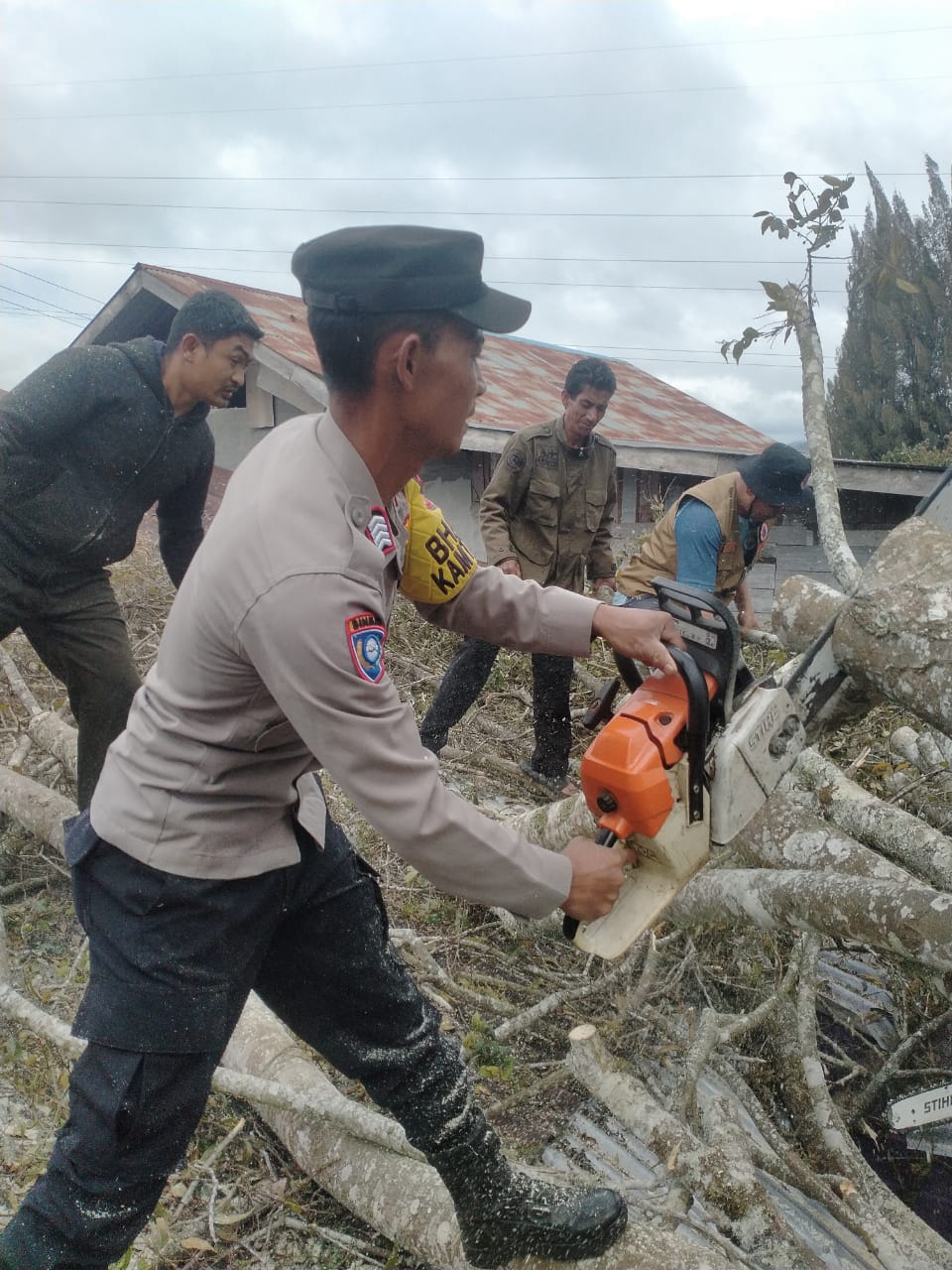 “Setelah menerima informasi, personel langsung menuju lokasi kejadian guna membantu warga membersihkan material pohon tumbang serta mengecek kondisi rumah yang terdampak,” ujar AKP Iskandar Wijaya.