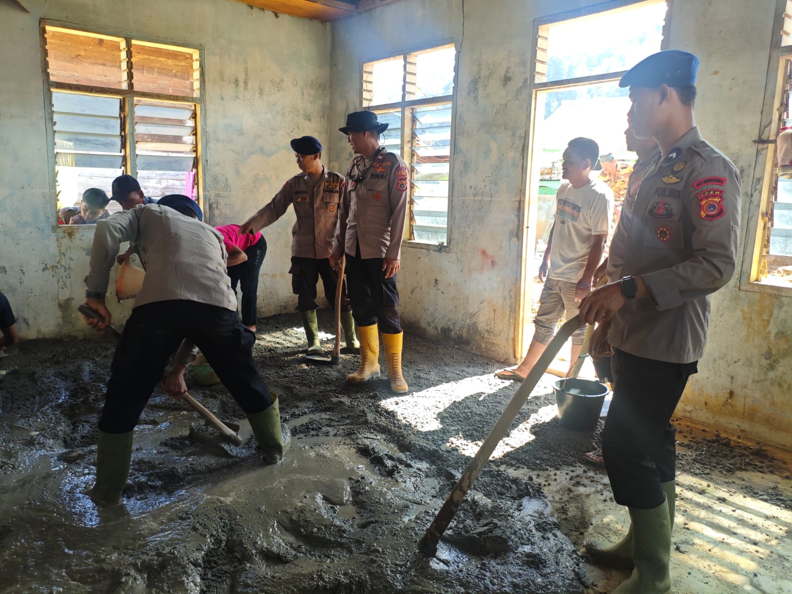 Jajaran Kepolisian Resor Aceh Tengah bersama Mahasiswa STIK-PTIK Angkatan 83 Lemdikkat Polri, BKO Brimob Polda Aceh, serta jajaran Polsek melaksanakan kegiatan gotong royong pemulihan fasilitas umum dan tempat ibadah di tiga lokasi wilayah Kabupaten Aceh Tengah, Jumat pagi (13/2/2026).