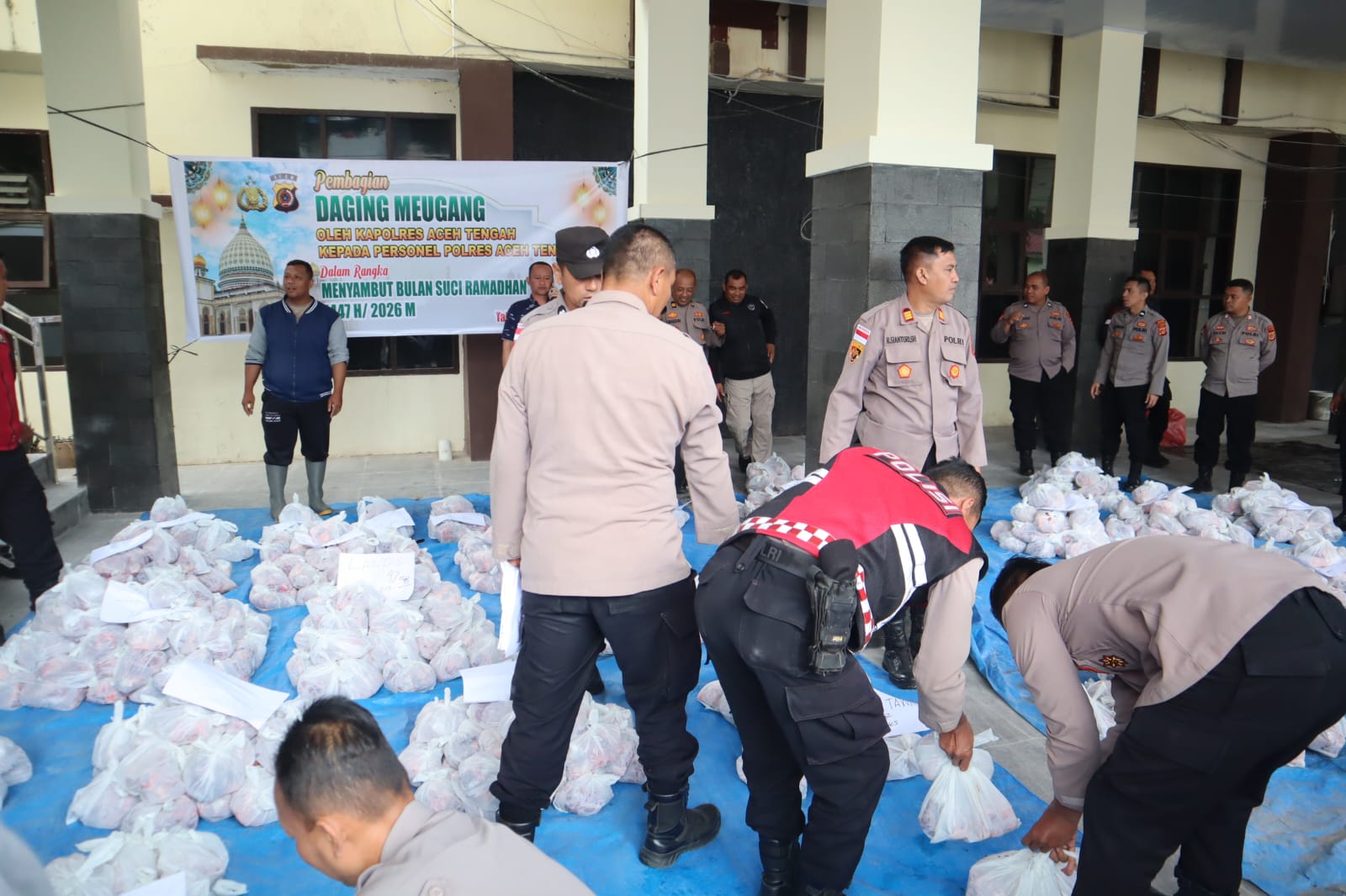 Dalam rangka menyambut bulan suci Ramadhan 1447 H, Polres Aceh Tengah menggelar kegiatan pembagian daging meugang kepada personel dan sejumlah penerima lainnya di Mapolres Aceh Tengah, Senin (16/2/2026) sekitar pukul 10.00 WIB.