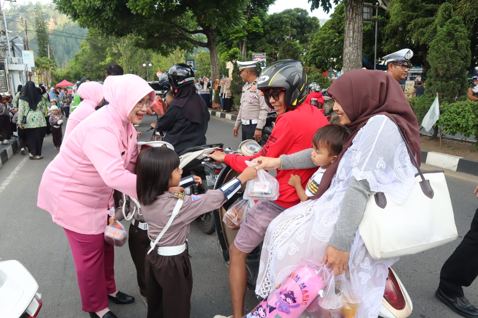 Sekolah TK Yayasan Kemala Bhayangkari (YKB) Aceh Tengah membagikan 250 paket takjil kepada masyarakat yang melintas menjelang waktu berbuka puasa.