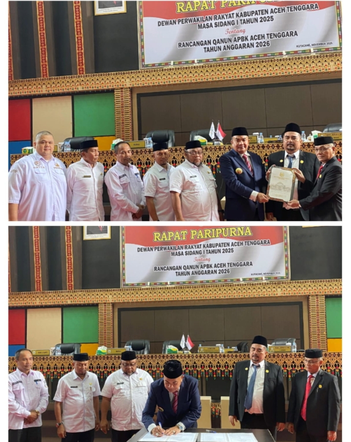 Di setujui seluruh Fraksi DPRK Aceh Tenggara. Sidang paripurna Rancangan Qanun (Raqan) Anggaran Pendapatan Belanja Kabupaten (APBK) Aceh Tenggara tahun 2026, resmi di tutup, Rabu (19/11).