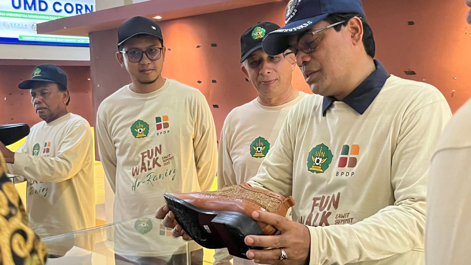 foto : Rektor UIN Ar Raniry Banda Aceh sedang melihat produk spatu dari bahan sawit. Minggu 16 November 2025.